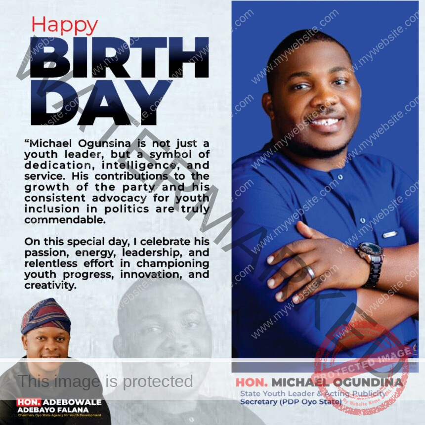 Hon. Adebowale Adebayo Falana, the Chairman of the Oyo State Agency for Youth Development, has extended heartfelt birthday wishes to the People’s Democratic Party (PDP) Youth Leader and Acting Publicity Secretary, Hon. Michael Ogunsina, describing him as a visionary youth leader and dedicated party loyalist.