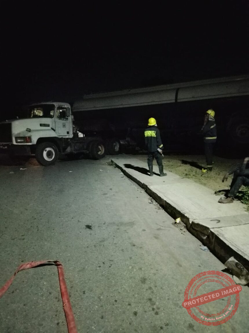 Firefighters, led by Assistant Chief Fire Superintendent (ACFS) Bamidele Samsudeen, were immediately mobilized to the scene. On arrival, they discovered a MACK trailer tanker (Reg. No. KSH329XA) loaded with 45,000 litres of Premium Motor Spirit (PMS) had swerved off course and obstructed the roadway, posing a serious risk of explosion and disrupting vehicular movement.