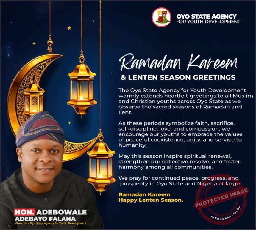 The Oyo State Agency for Youth Development, under the Leadership of Hon. Adebowale Adebayo Falana has extended warm greetings to Muslim and Christian youths across Oyo State as they observe the sacred seasons of Ramadan and Lent.