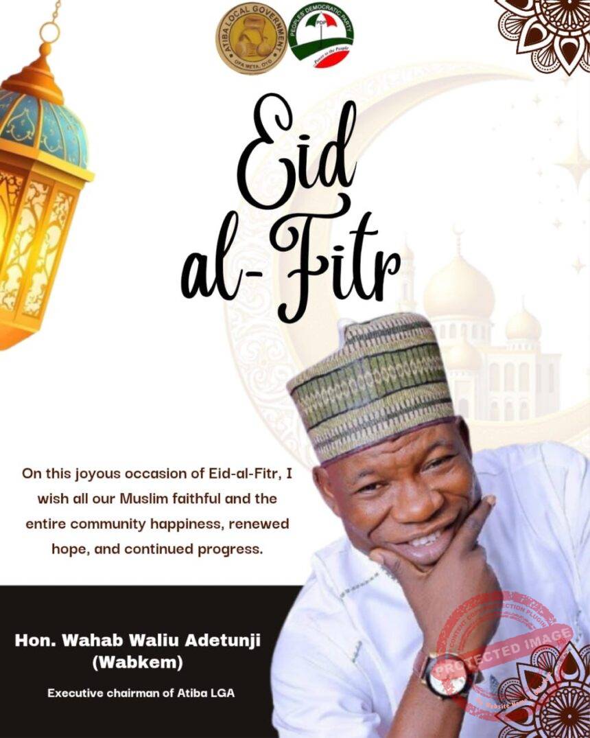 The Executive Chairman of Atiba Local Government, Hon. Wahab Waliu Adetunji (WABKEM), has extended warm felicitations to Muslim faithful and the entire Atiba community on the auspicious occasion of Eid al-Fitr.