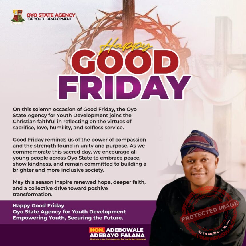 The Oyo State Agency for Youth Development, under the leadership of Hon. Adebowale Adebayo Falana, has extended warm felicitations to Christians across the state and beyond on the occasion of Good Friday, urging them to reflect deeply on the enduring virtues of sacrifice, love, and humility.