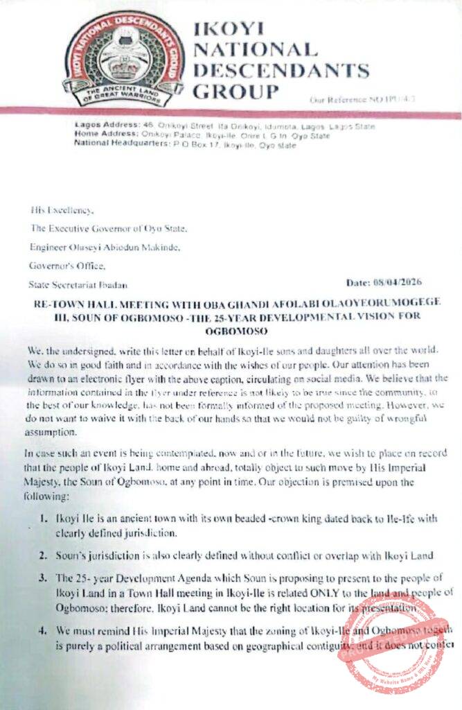 In a statement signed by Prince Soliu Ayinde and other representatives of the community, and issued on behalf of Ikoyi-Ile indigenes at home and in the diaspora, the group expressed concern over an electronic flyer circulating on social media, which announced the planned meeting to be held in Ikoyi Ile. The group noted that it had not received any formal communication regarding the event, raising doubts about its authenticity.