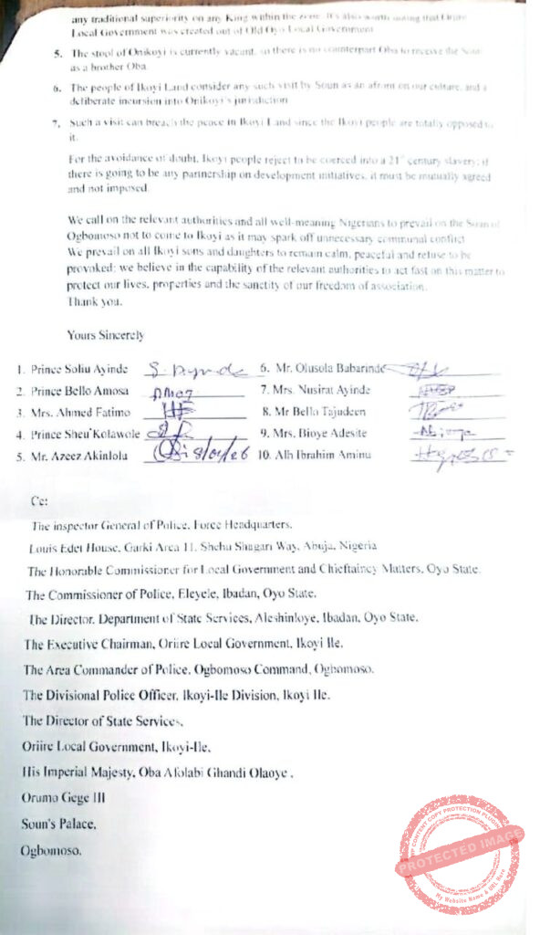 The statement emphasized that Ikoyi Ile is an ancient town with its own traditional authority, tracing its heritage to Ile-Ife, and operates within a clearly defined jurisdiction distinct from that of Ogbomosoland. According to the group, no historical or traditional overlap between the domains of Ikoyi Ile and Ogbomosoland would justify hosting such an event in Ikoyi Ile.